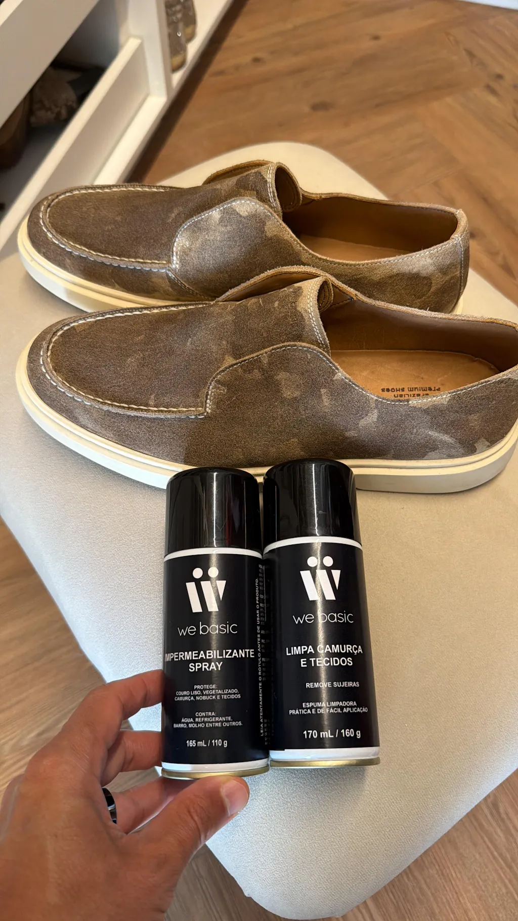 Utilize o impermeabilizante ou spray, para evitar manchas e aumentar a durabilidade do seu calçado; Evite utilizar água ao lavar; recomendamos o limpa-camurça combinado à escova de toque macio. Evite a exposição direta ao sol ao secar, pois pode ressecar e alterar a cor do calçado. Para poeira leve, utilize um pano de microfibra úmido.